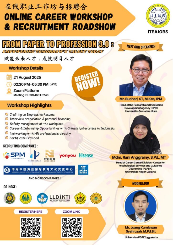 🎓✨ From Paper to Profession: Empowering Tomorrow’s Talent Today ✨🎓 Speakers:🎤 Mr. Buchari (Universitas Sumatera Utara)🎤 Mdm. Rany Angraini (Universitas Negeri Jakarta) 🗓 Date: 21 August 2025🕝 Time: 2:30 PM – 5:30 PM (WIB)📍Meeting ID: 899 4681 0246📝Register here: https://forms.gle/EXwH6ET9mWDgXHpD6 🎙 Moderator: Juang Kurniawan Syahruzah (Universitas PGRI Yogyakarta) 🎫 Certificate Provided!🔗 Register now & secure […]