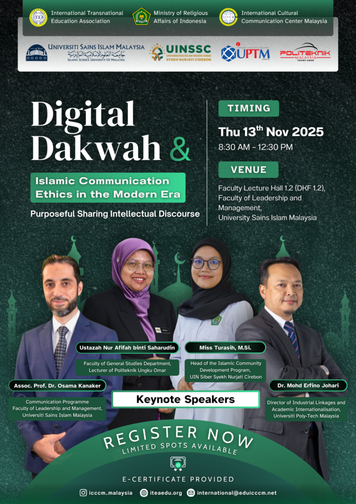 Explore effective ways to communicate Islam online with wisdom (hikmah), ethical principles, and meaningful impact in today’s digital environment. Join our distinguished panel of scholars and digital content creators from four partner universities, followed by a practical Digital Engagement Session. Date: Thursday, 13 November 2025Time: 8:30 AM – 12:30 PMVenue: Faculty Lecture Hall 1.2 (DKF […]