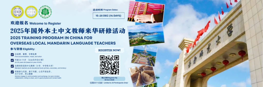 【2025年国外本土中文教师来华研修项目】🌏✨ 提升教学 · 体验中国文化 ✨ 📅 2025年12月15日—12月28日📍 海南师范大学 国际教育学院💰 全程免费(含食宿、交通、门票)✈ 自理国际旅费(机票、签证等) 👥 非中国籍海外中文教师|20–55岁|具中文交流能力|ITEA会员🎯 名额30名 · 先到先得⏰ 截止:2025年10月30日🔗 报名: https://forms.gle/5tku6naYFwqjmFnu8 #ITEA #ICCCM #海南师范大学 #中文教师研修 #中文教育 【2025 Training Program in China】 🌏✨ Enhance Your Teaching · Experience China ✨ 📅 Dec 15–28, 2025📍 Hainan Normal University💰 Fully funded (meals, stay, transport)✈ Self-paid airfare & visa 👥 Non-Chinese […]