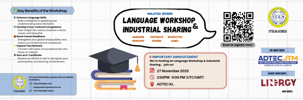 Join us for a Language Workshop & Industrial Sharing at ADTEC KL! 🗓️ Date: 27 November 2025🕑 Time: 2:00 PM – 5:00 PM 📍 Venue: ADTEC KL This workshop is your chance to learn practical Mandarin, understand Chinese business culture, and gain insights from industry professionals! 🎓 All participants who register and attend will receive […]